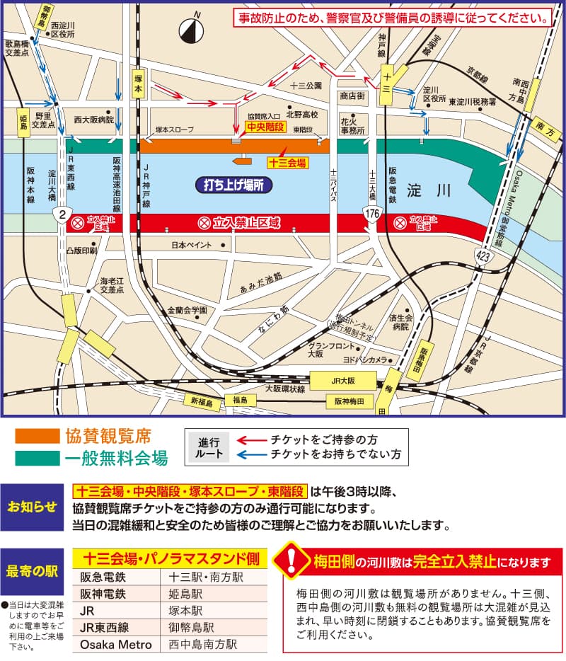 今年は、梅田会場側河川敷での観覧がが禁止されており、例年とは違った部分もありますので事前に会場案内図をよく確認した上で来場してください。