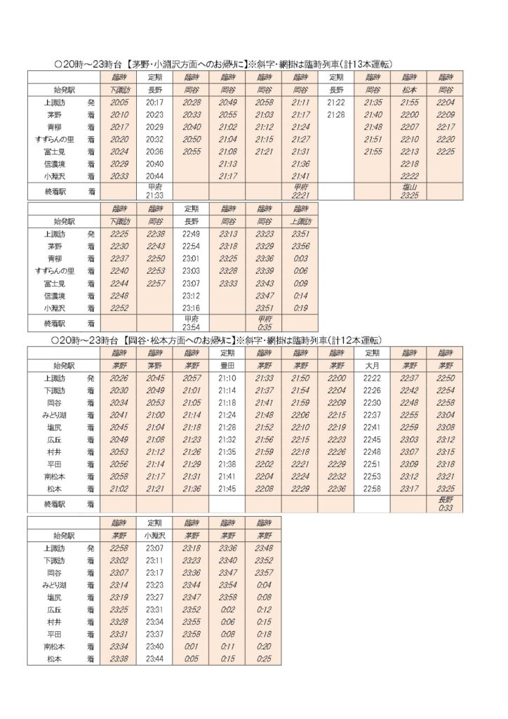 - 20:00〜23:00台 岡谷・松本方面:茅野発 20:26 など12本が臨時便 ※最終便は、茅野発 23:48